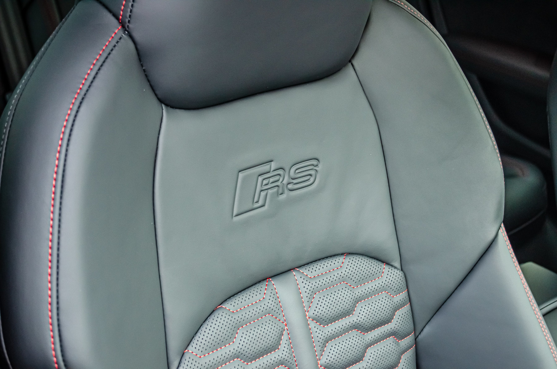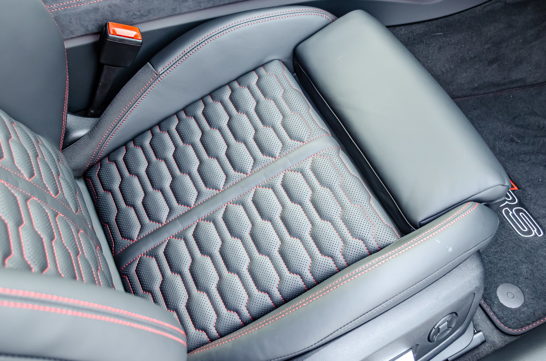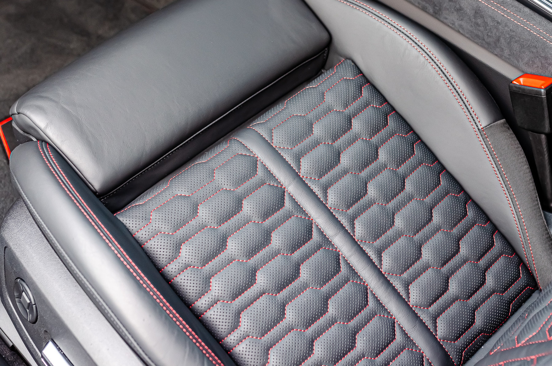Отделка из натуральной перфорированной кожа Valcona с красной контрастной строчкой.