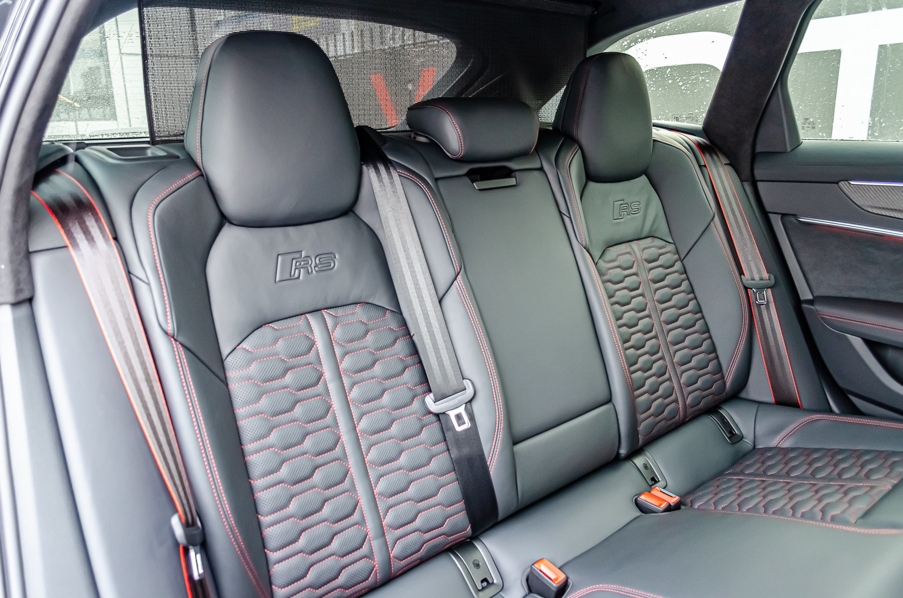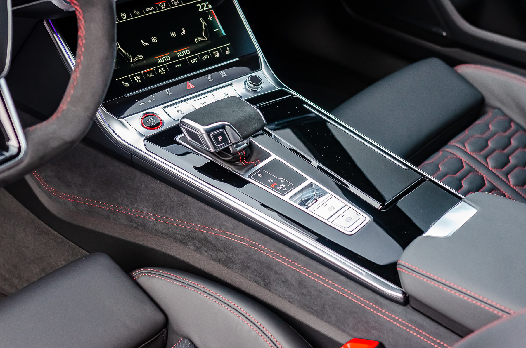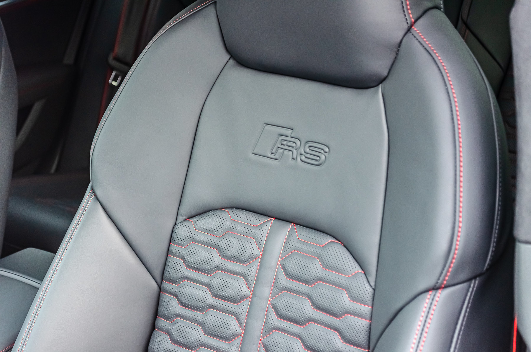 Отделка из натуральной перфорированной кожа Valcona с красной контрастной строчкой.