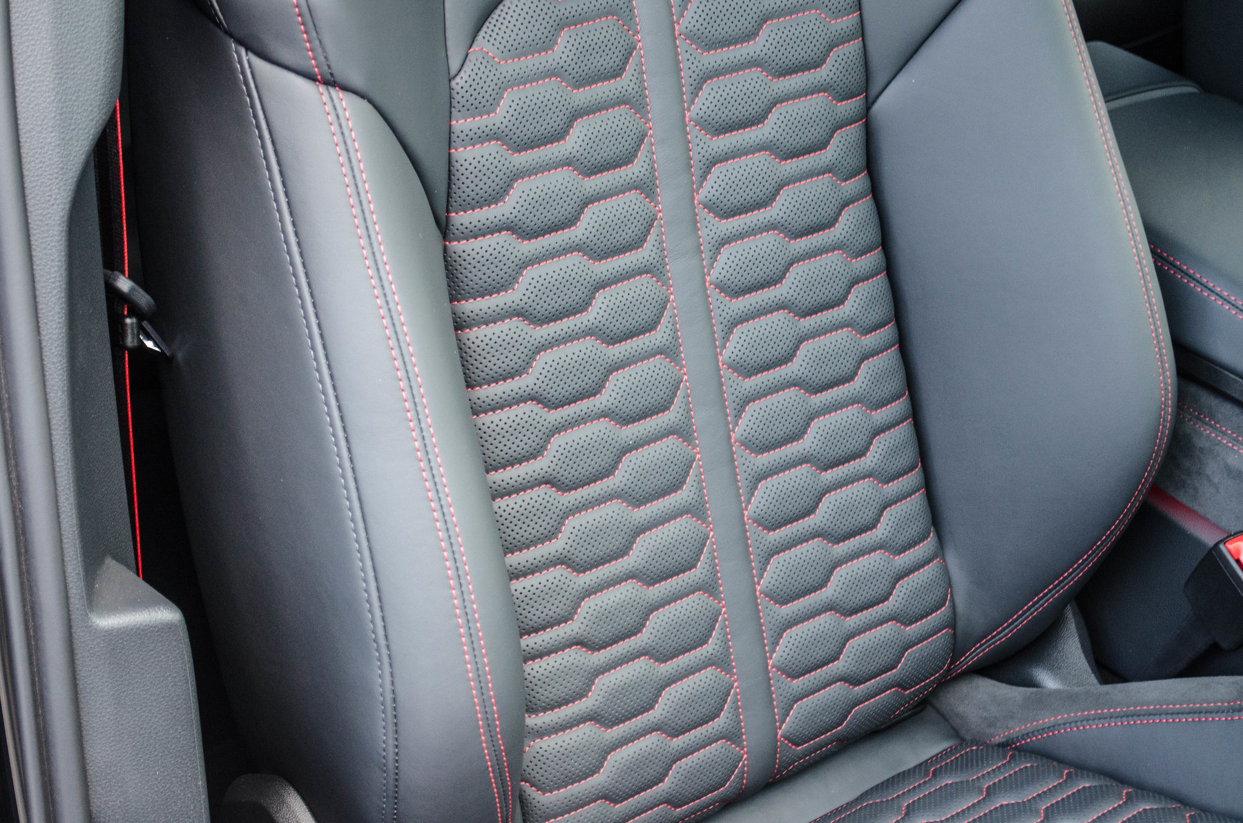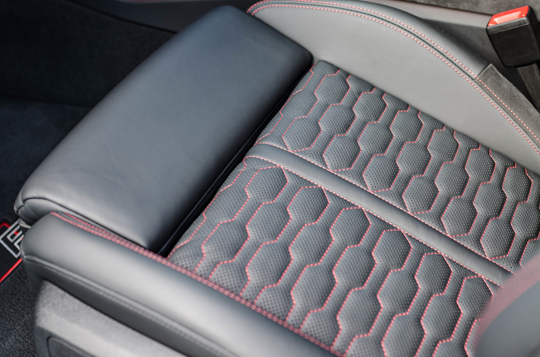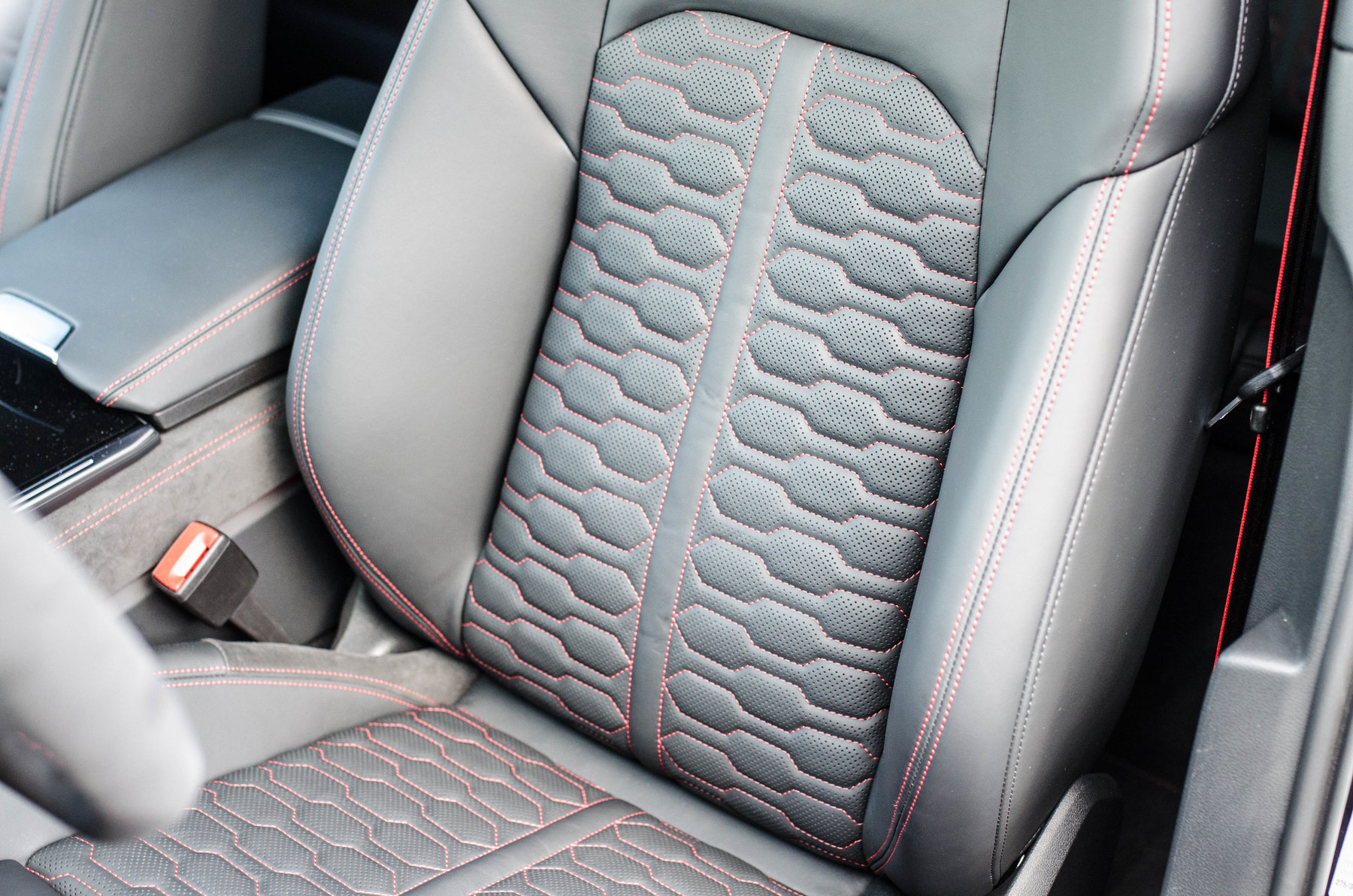 Отделка из натуральной перфорированной кожа Valcona с красной контрастной строчкой.