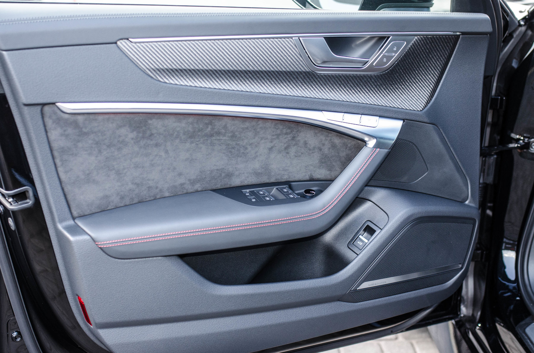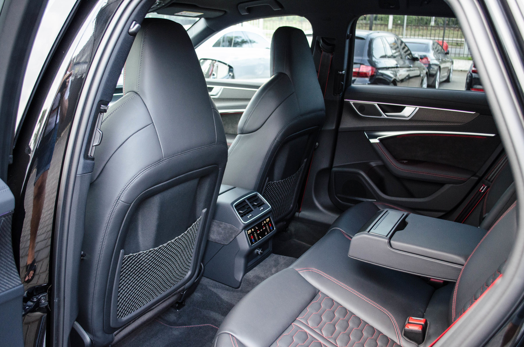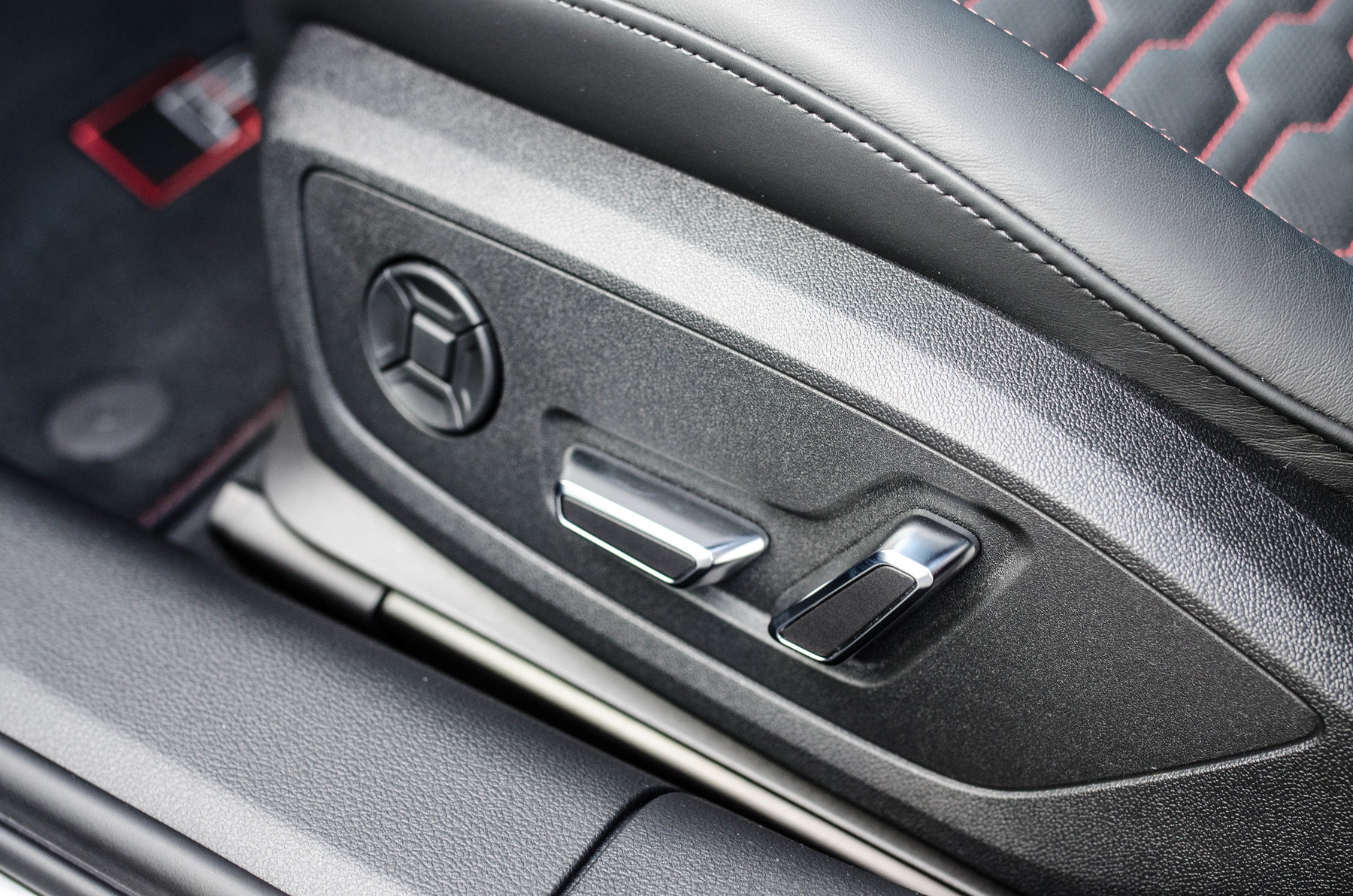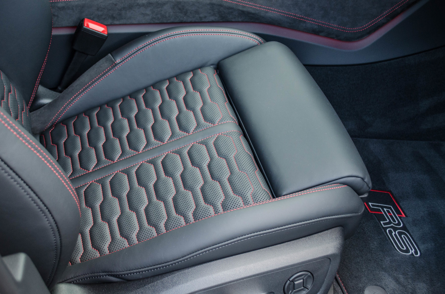 Отделка из натуральной перфорированной кожа Valcona с красной контрастной строчкой.