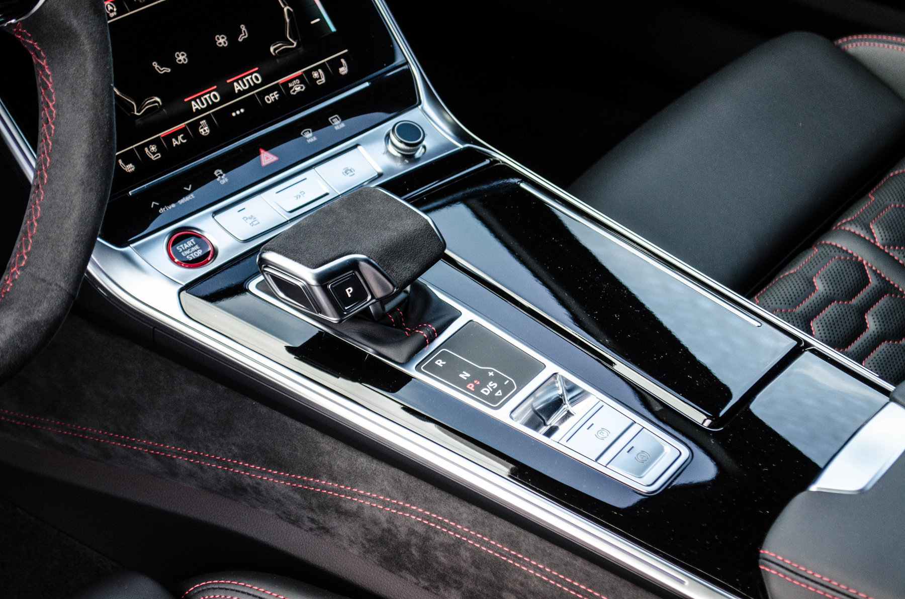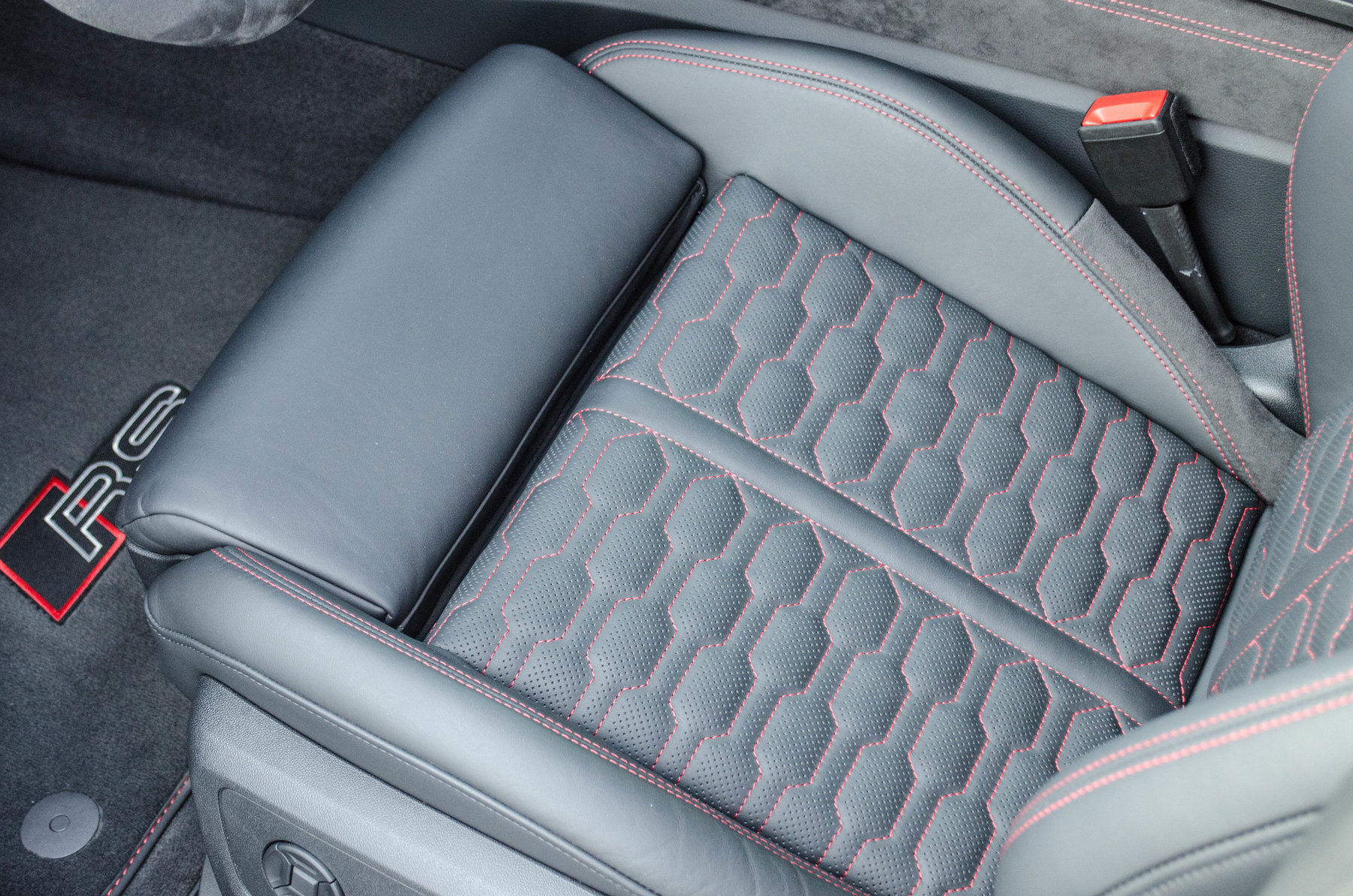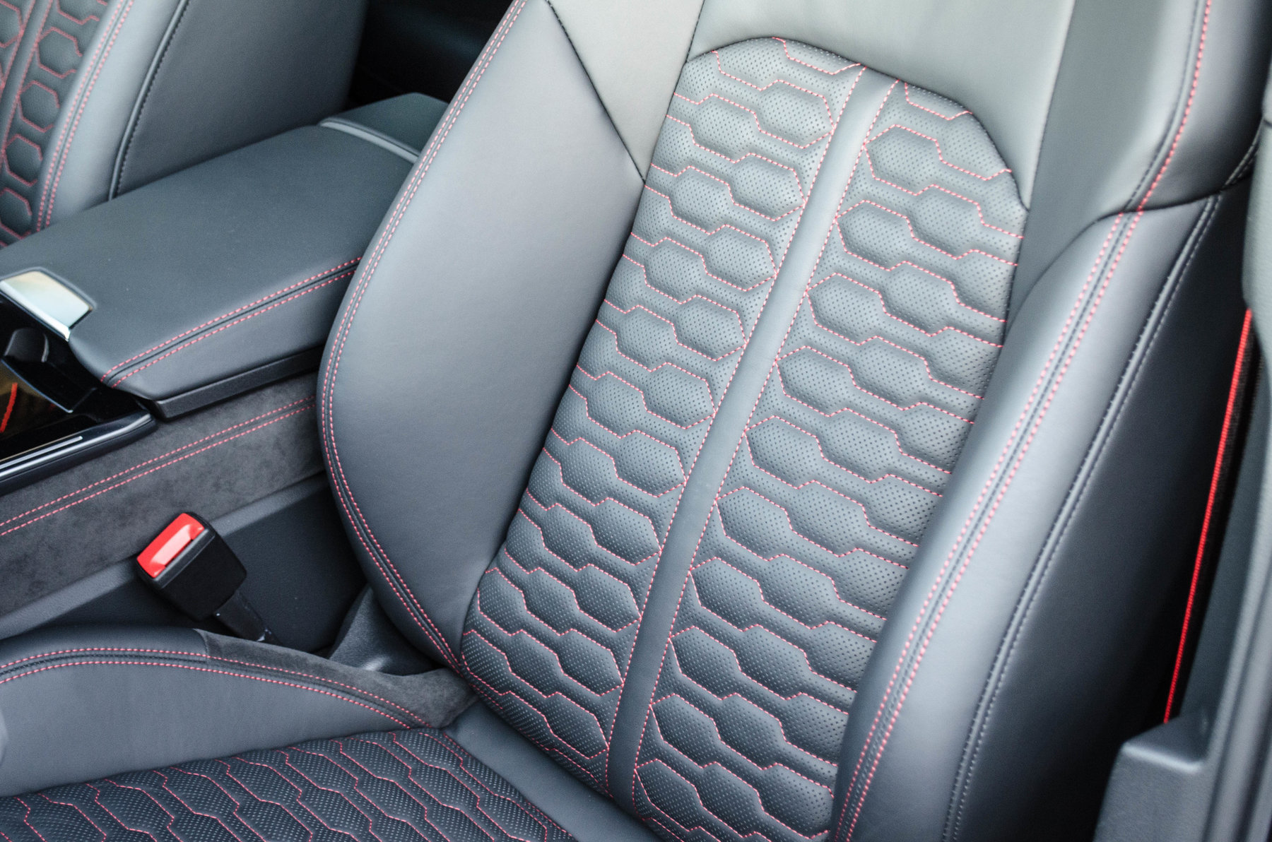 Отделка из натуральной перфорированной кожа Valcona с красной контрастной строчкой.