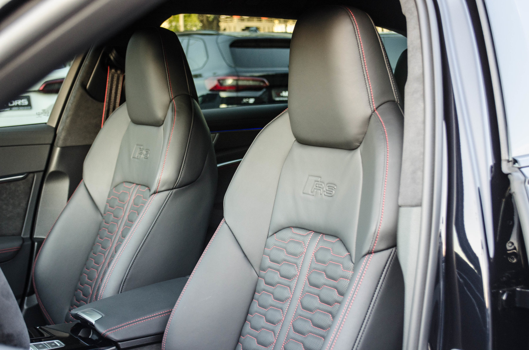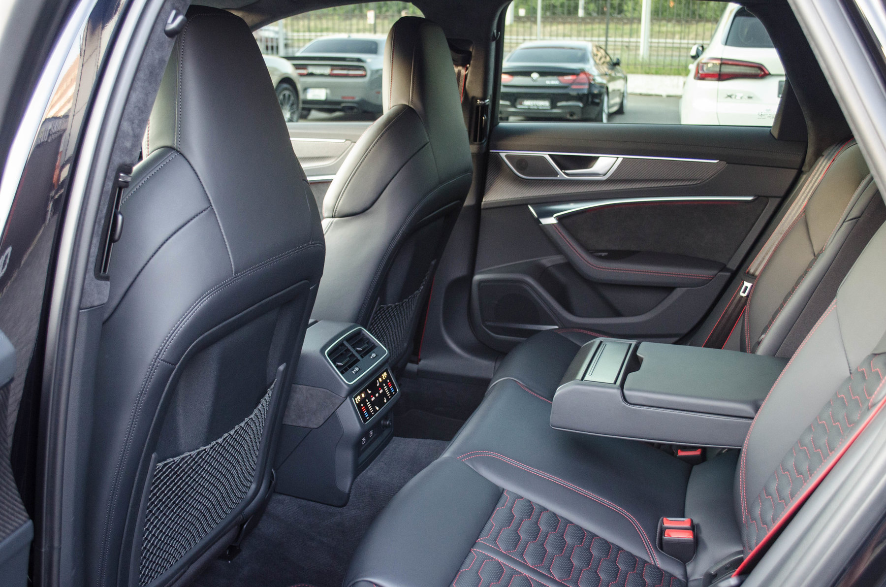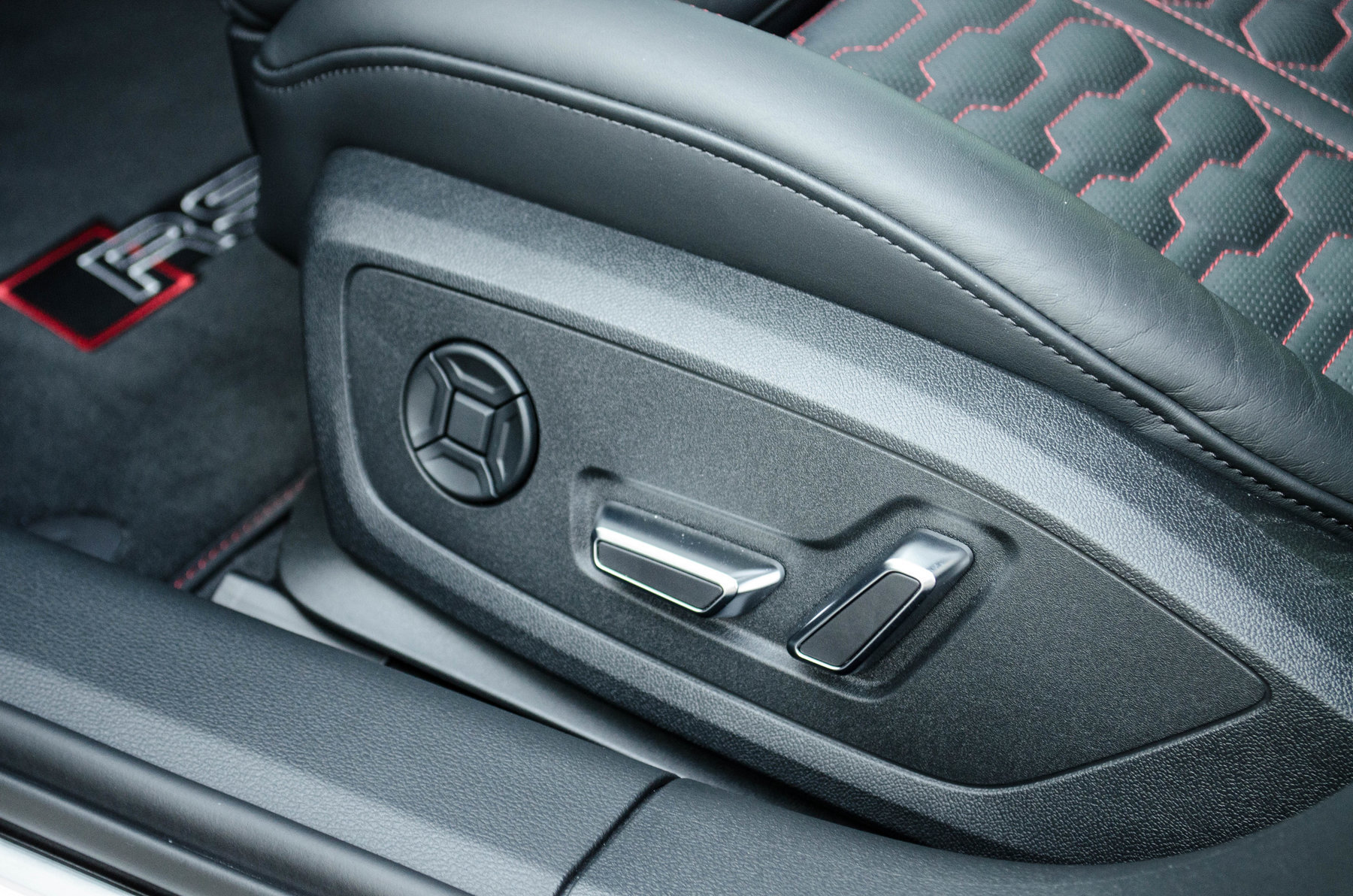 Отделка из натуральной перфорированной кожа Valcona с красной контрастной строчкой.