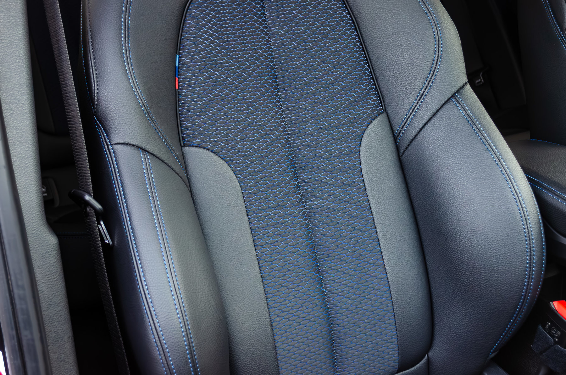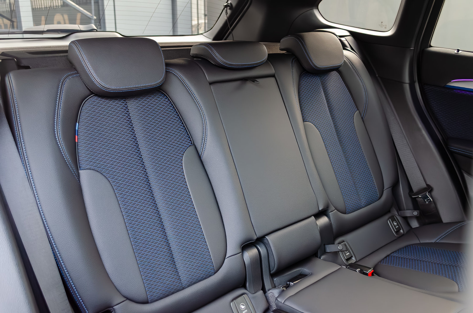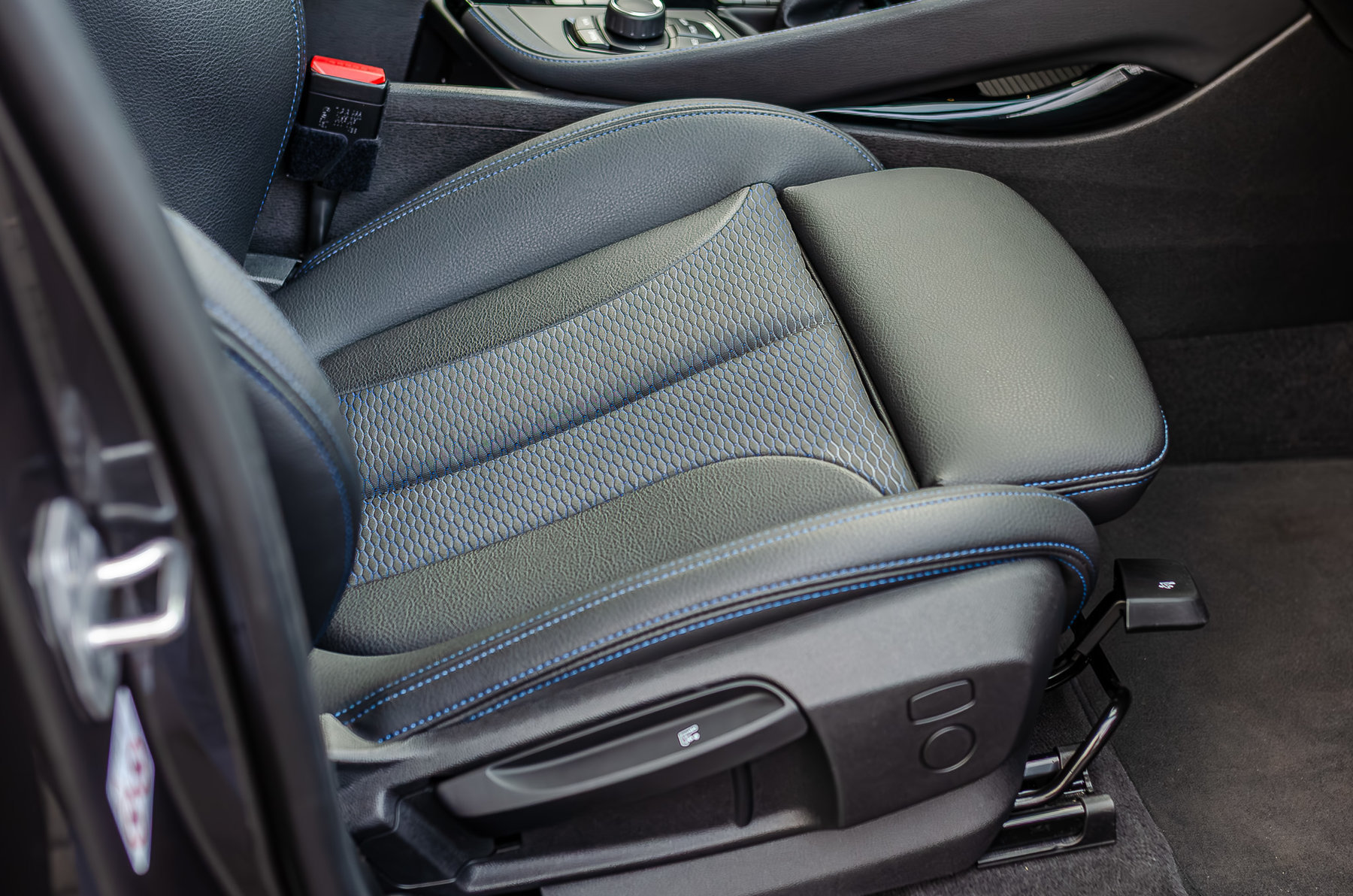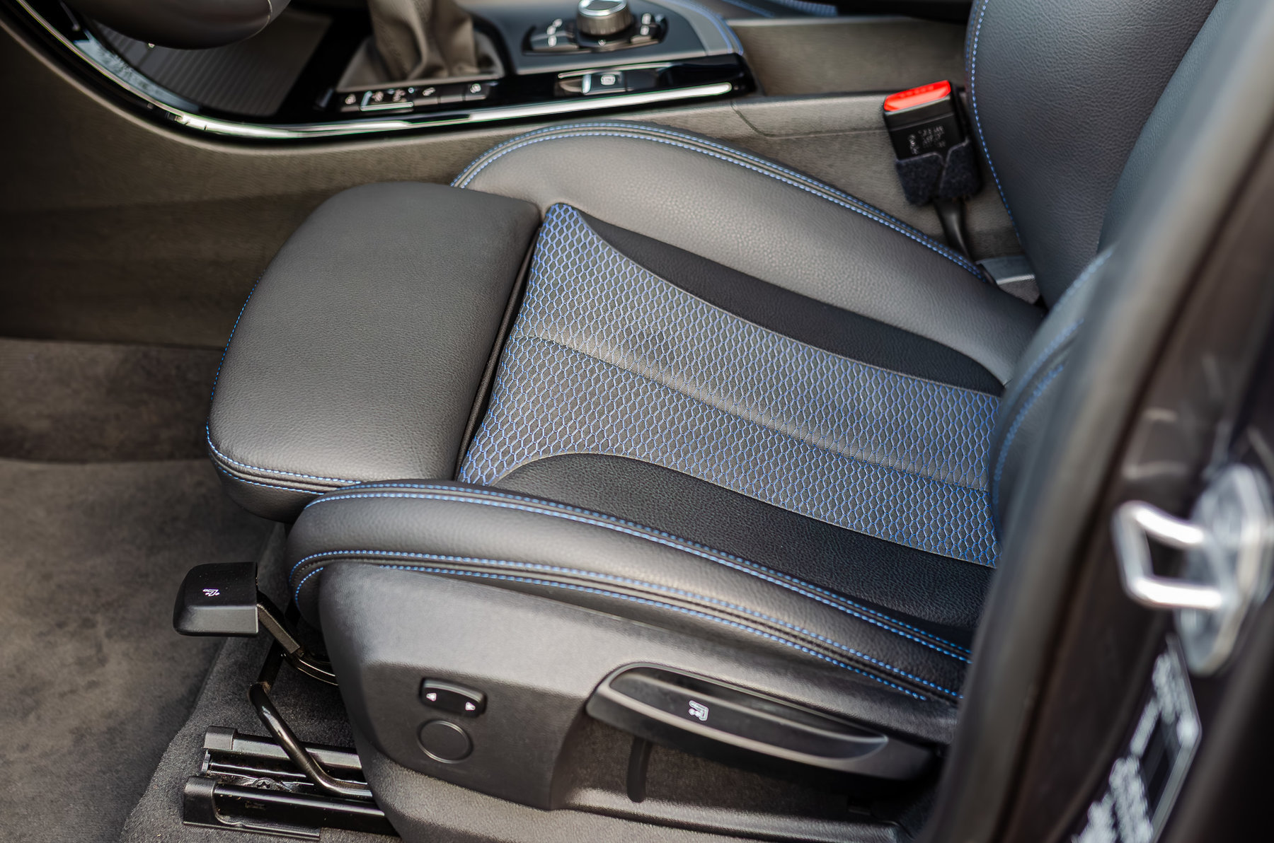 Комбинированный салон с контрастной синей строчкой.