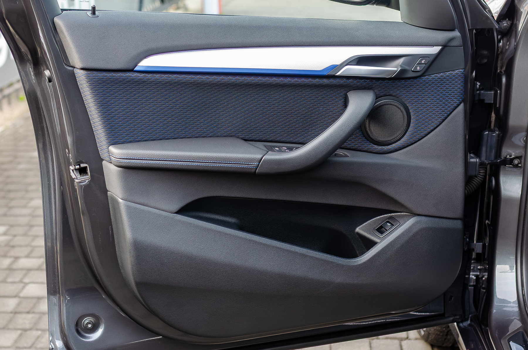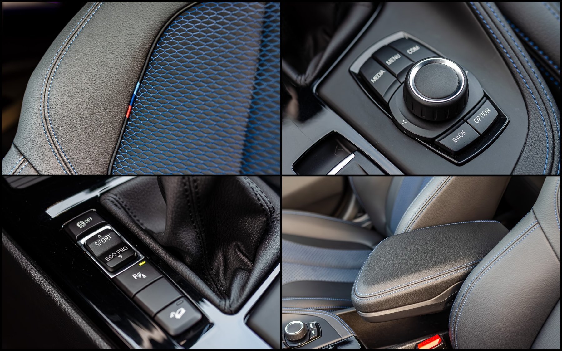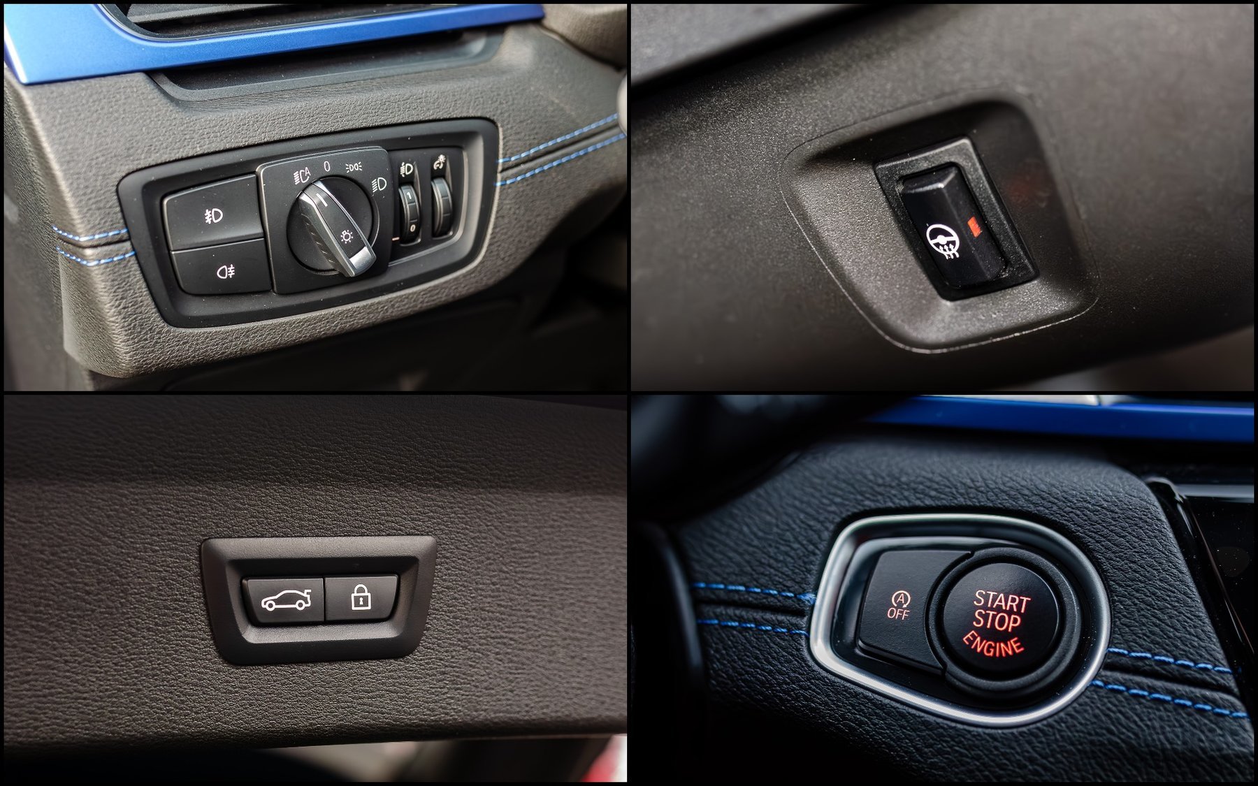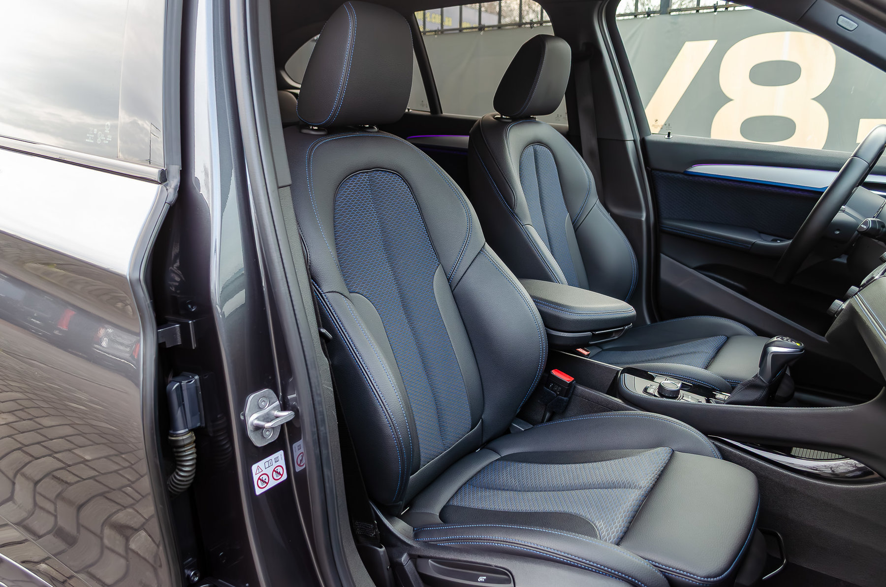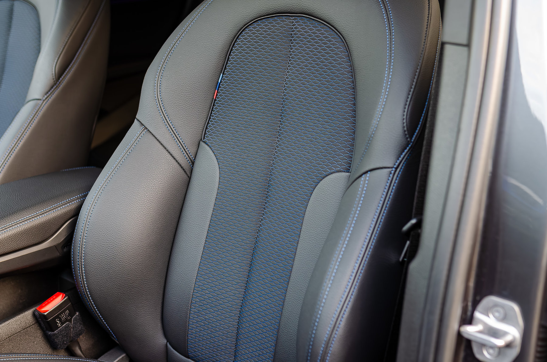 Комбинированный салон с контрастной синей строчкой.